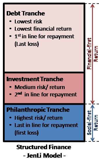 By philanthropic capital, we mean capital which prioritises social returns over financial returns; it includes charitable gifts and donations, grants (recoverable or irrecoverable), development and/or relief aid, programme related investments, impact-first investments, venture philanthropy, patient capital etc. Providers of this capital are prepared to accept an inversion of the normal risk-return ratio and deploy their capital for either no financial return or below market-rate return in exchange for securing social outcomes, and the capital is often deployed over much longer periods than would normally be expected from commercial sources. The JenLi Model pools this capital within a first-loss/high-risk tranche at the base of the structured finance stack and it is deployed solely at the discretion of the JenLi Foundation.